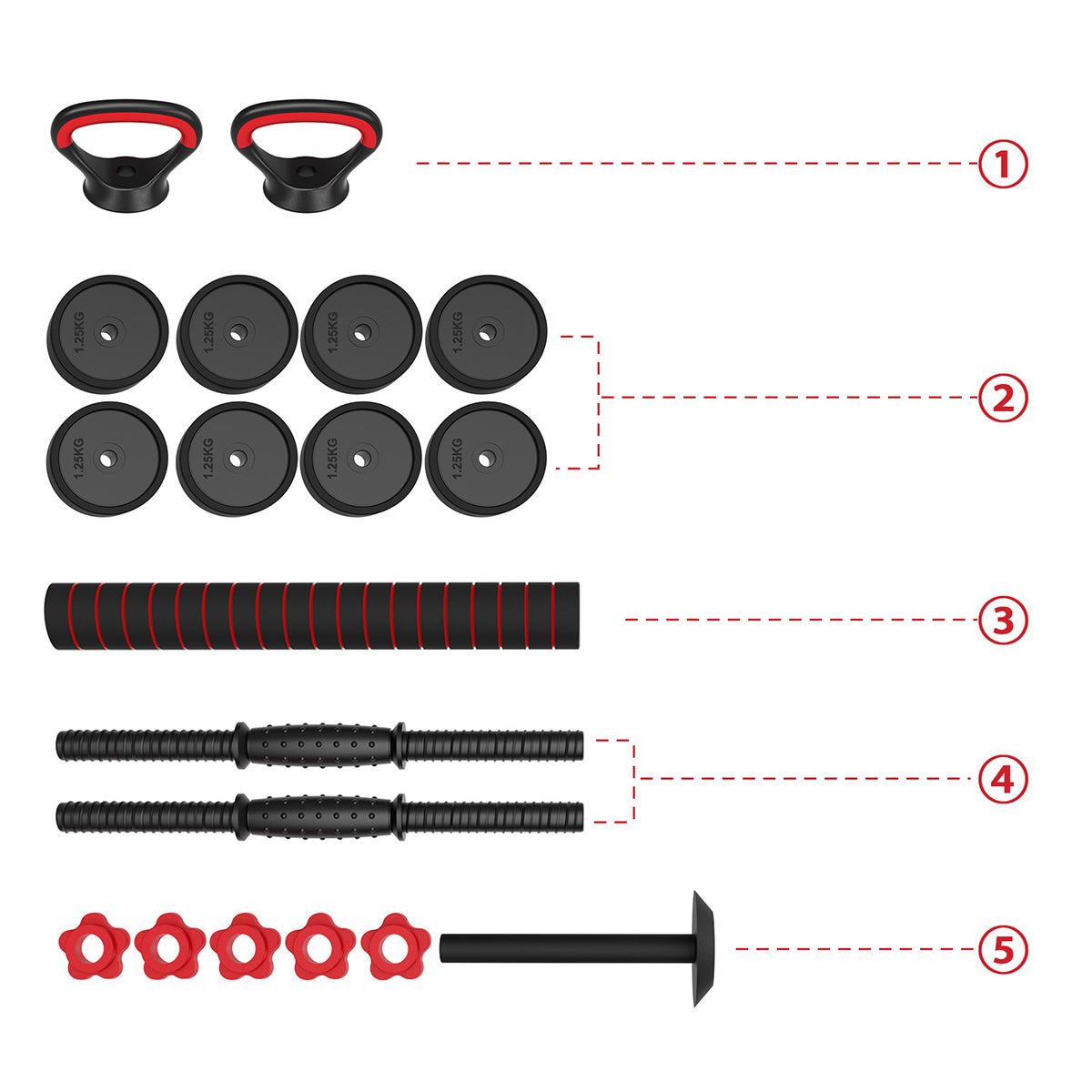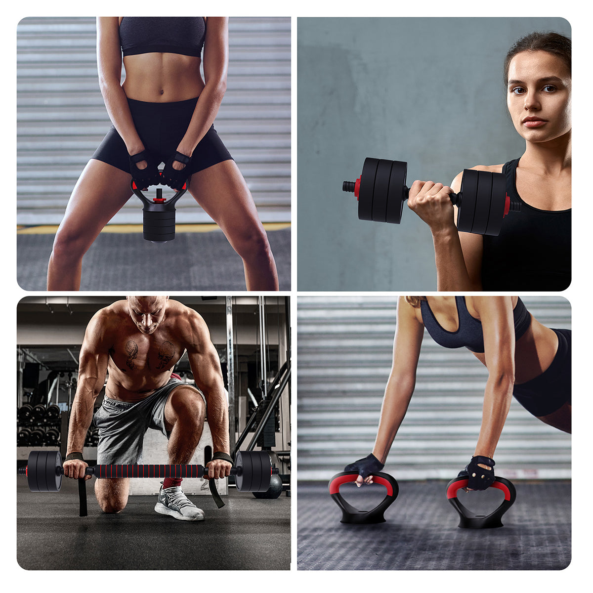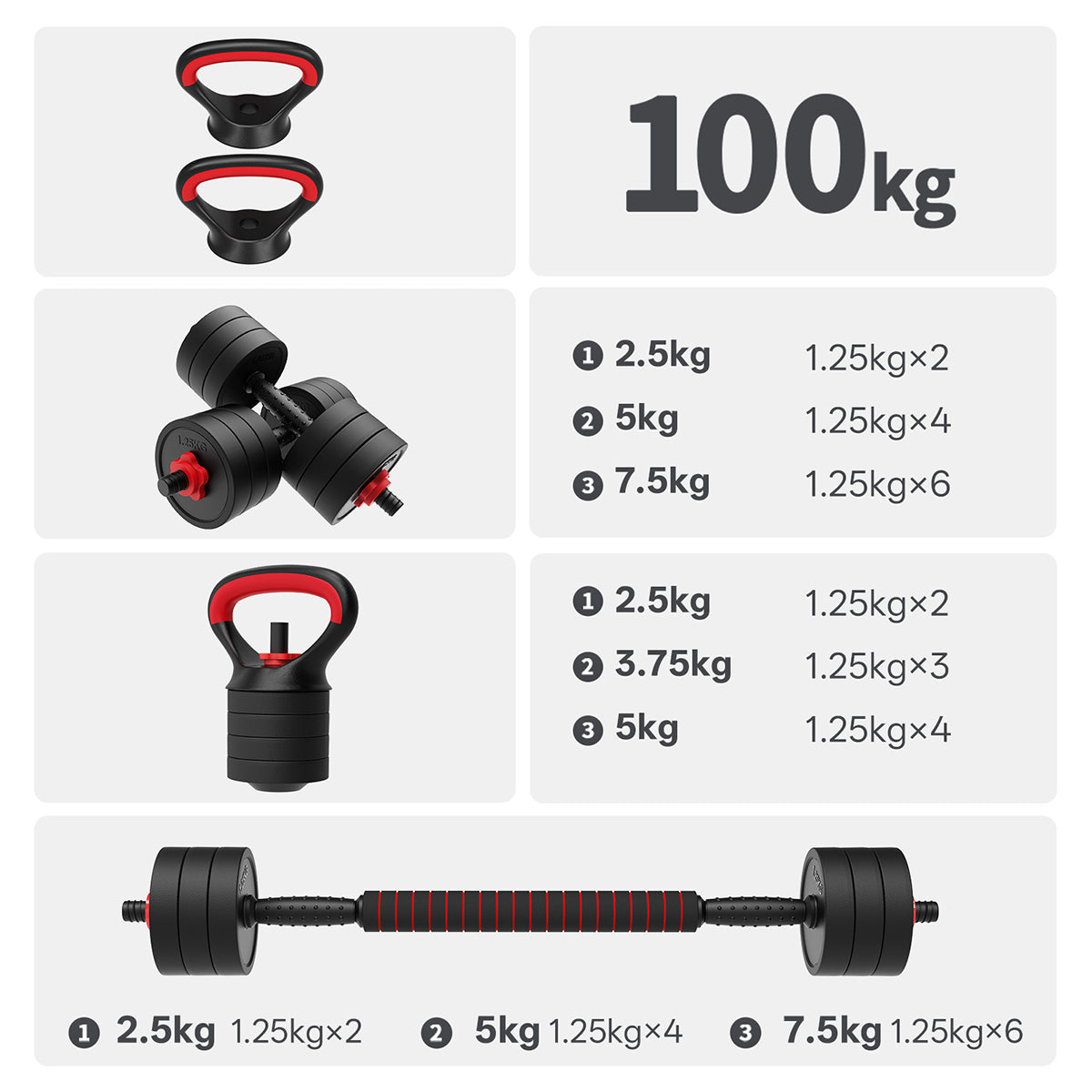 With the adjustable dumbbell set, you can combine the weights freely, and one set lets you complete four types of workouts!
