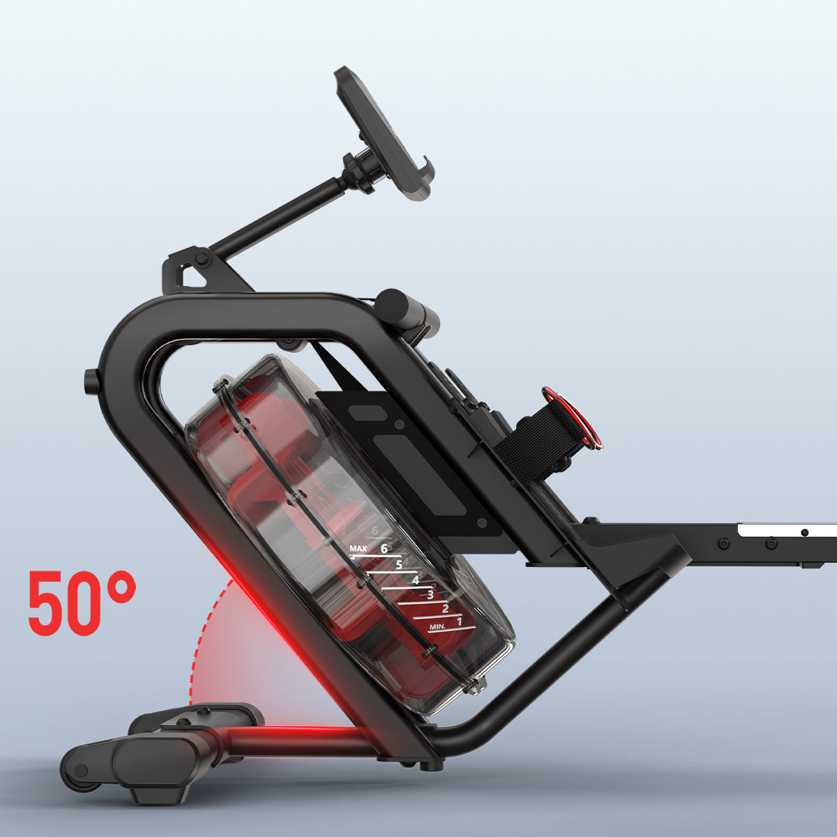 Erleben Sie Intensität auf höchstem Niveau mit dem 50° geneigten Wassertank des JOROTO MR26, der für 30 % mehr Widerstand als herkömmliche Rudergeräte mit flachem Tank entwickelt wurde. Genießen Sie ein sanftes, herausforderndes und realistisches Rudertraining – bequem von zu Hause aus.